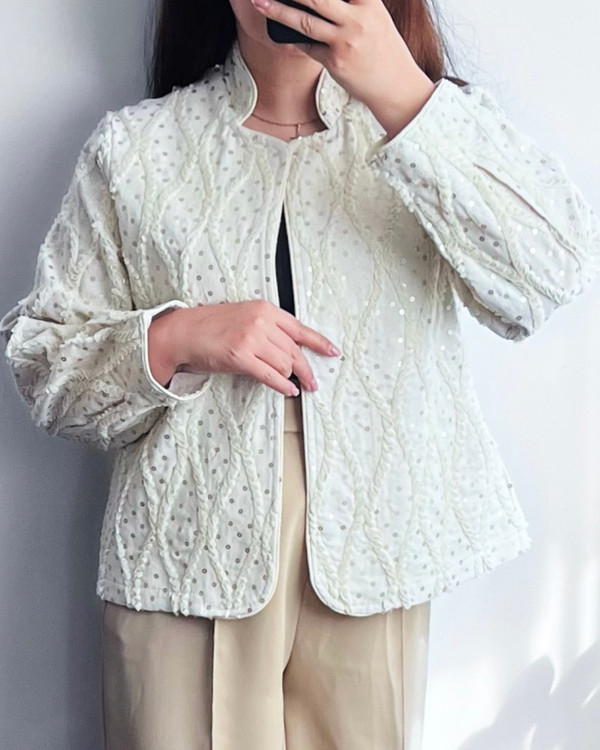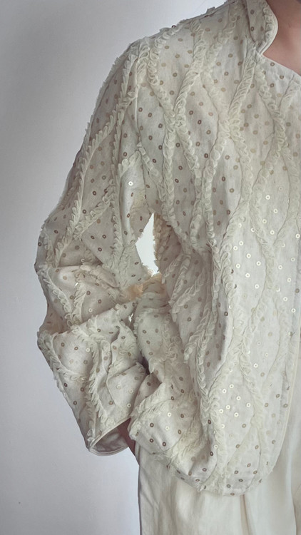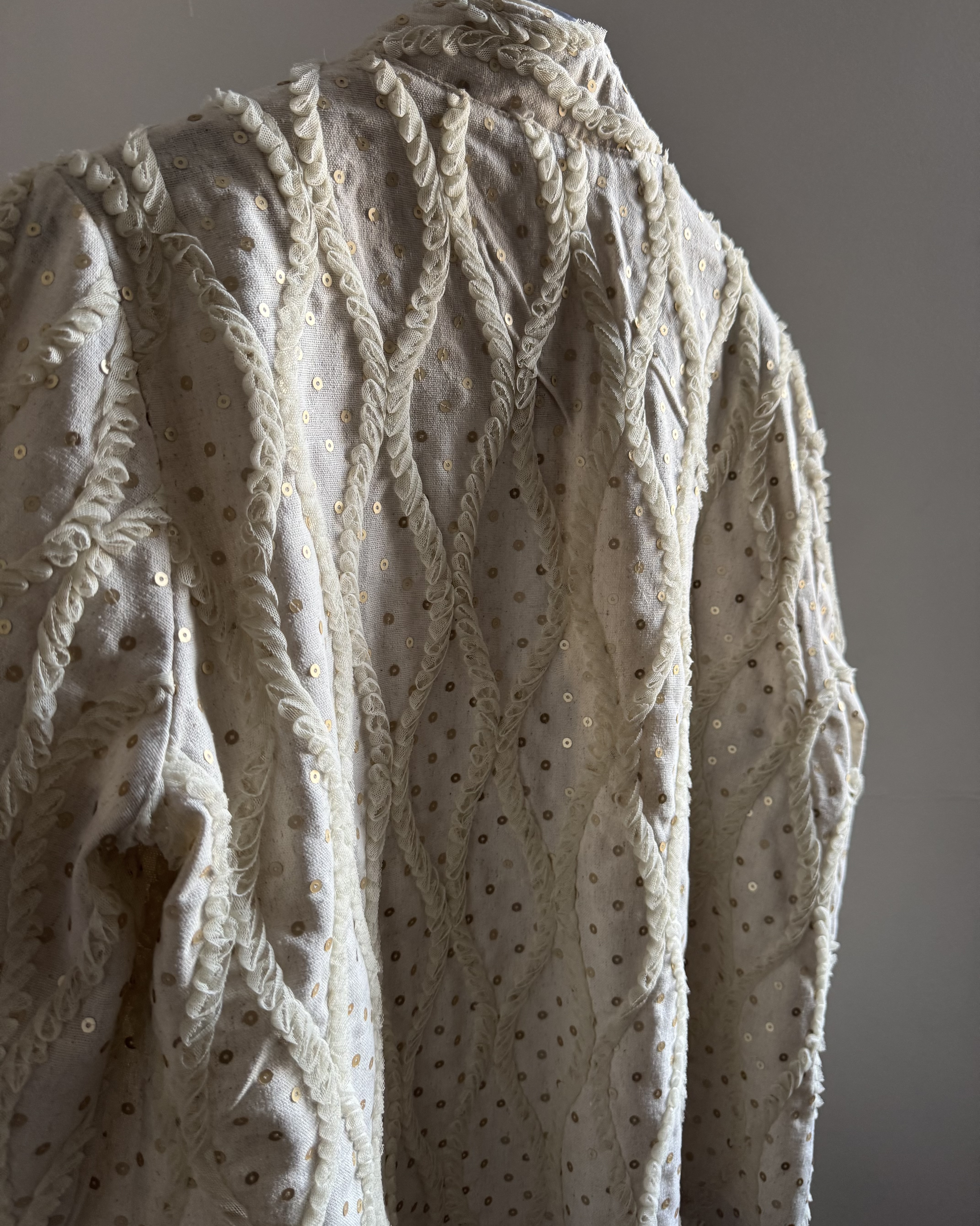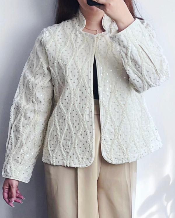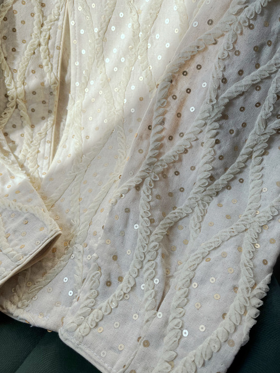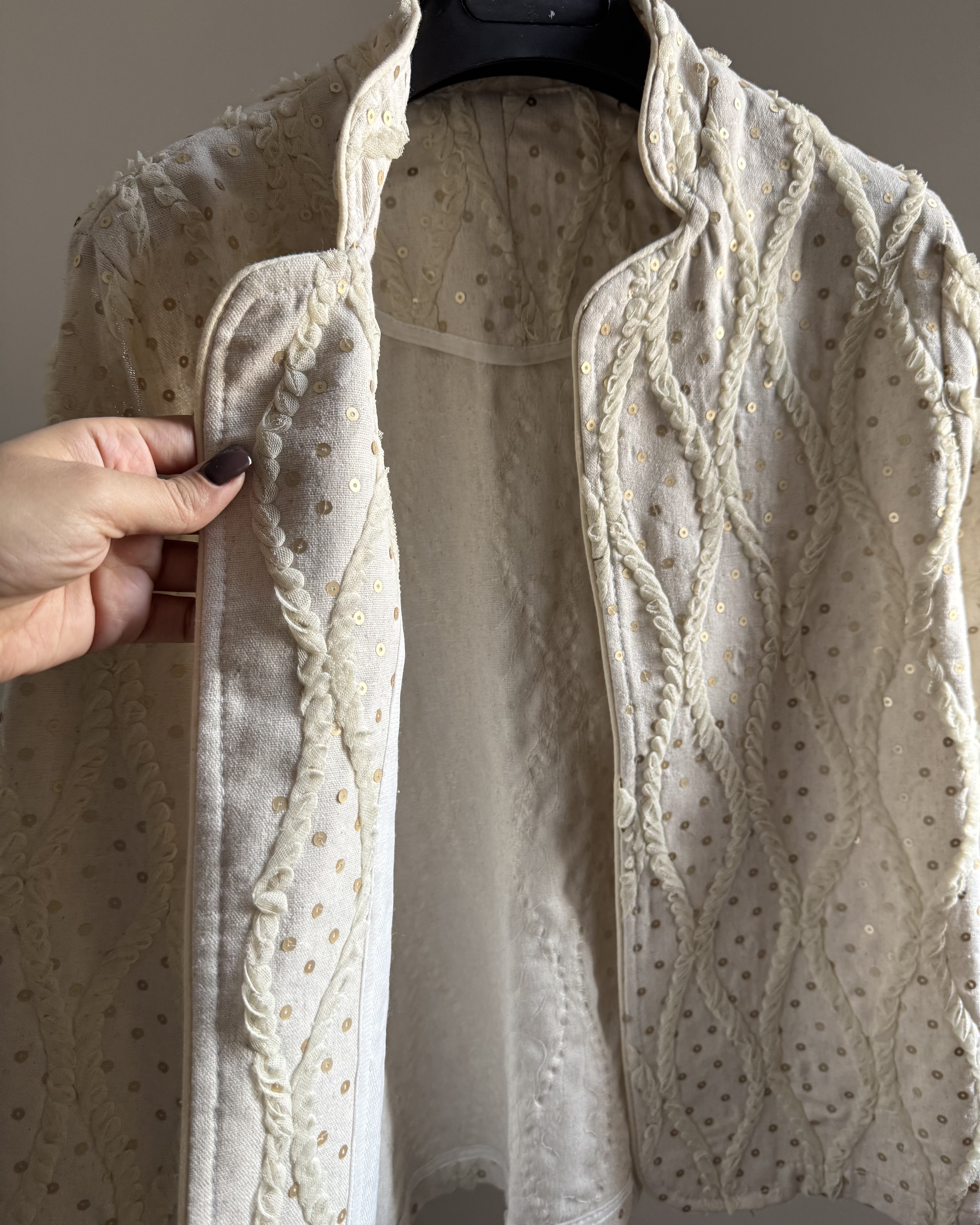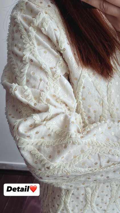 ♦پارچه این کت لینن گرم بالا میباشد که روی پارچه پولک های ریز رنگ مسی و با حریر کرم طرح های لوزی کار شده است.